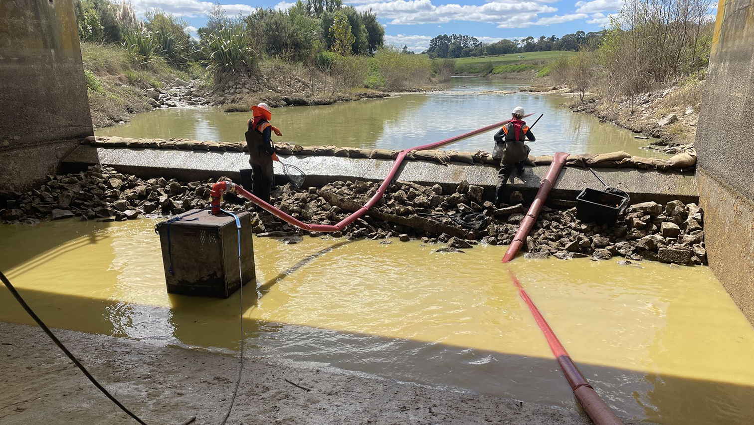 We had to hold back the water back, dewater the working area around the gate, and also relocate fish back into Lake Waikare (except for the pest fish – they were humanely euthanised).