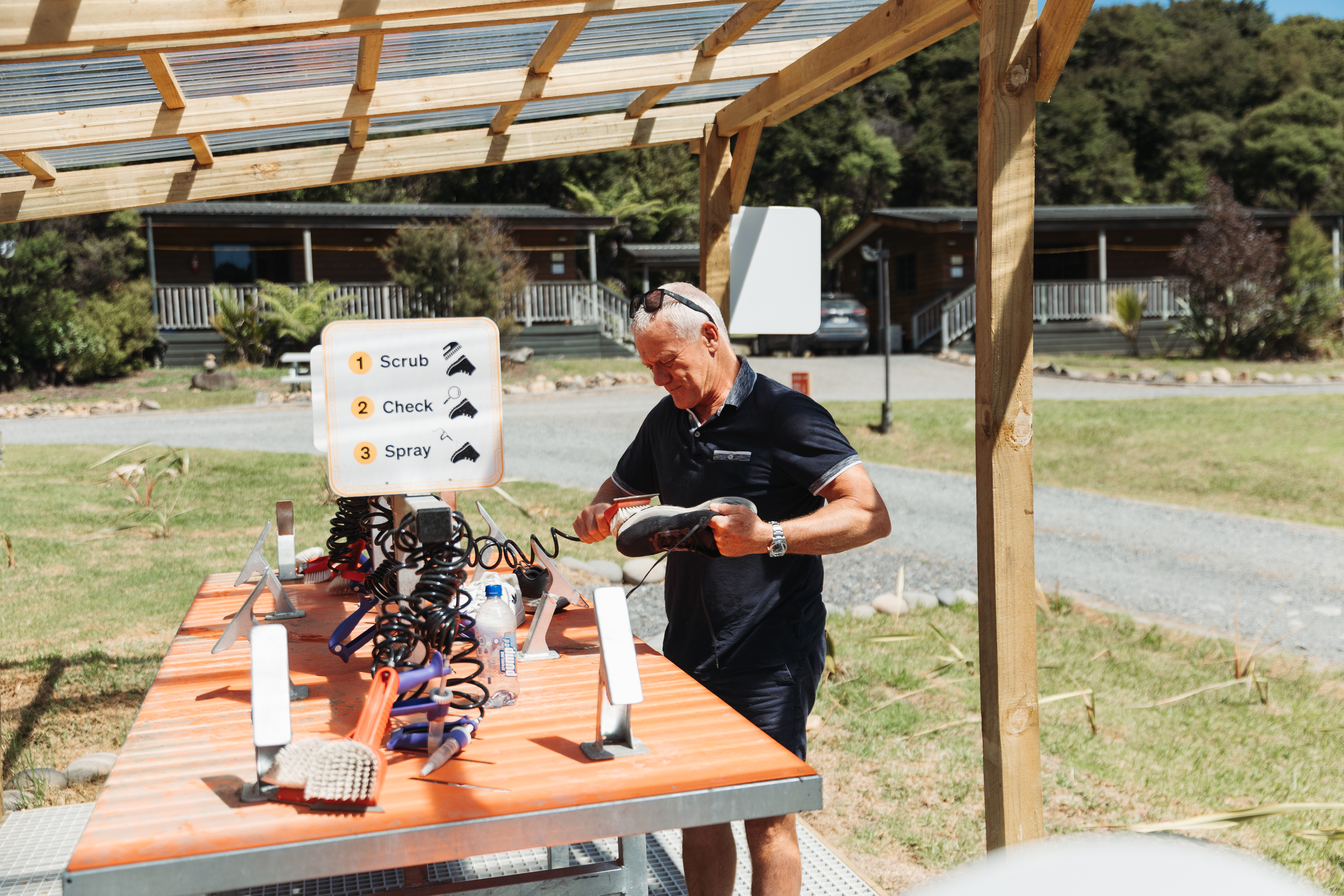 “Visitors arrive at the centre and the first thing they do is clean and inspect all of their footwear and equipment at the hygiene station,” says Waikato Regional Council Biosecurity Pathogens and Projects Unit Lead Amy Lendrum.