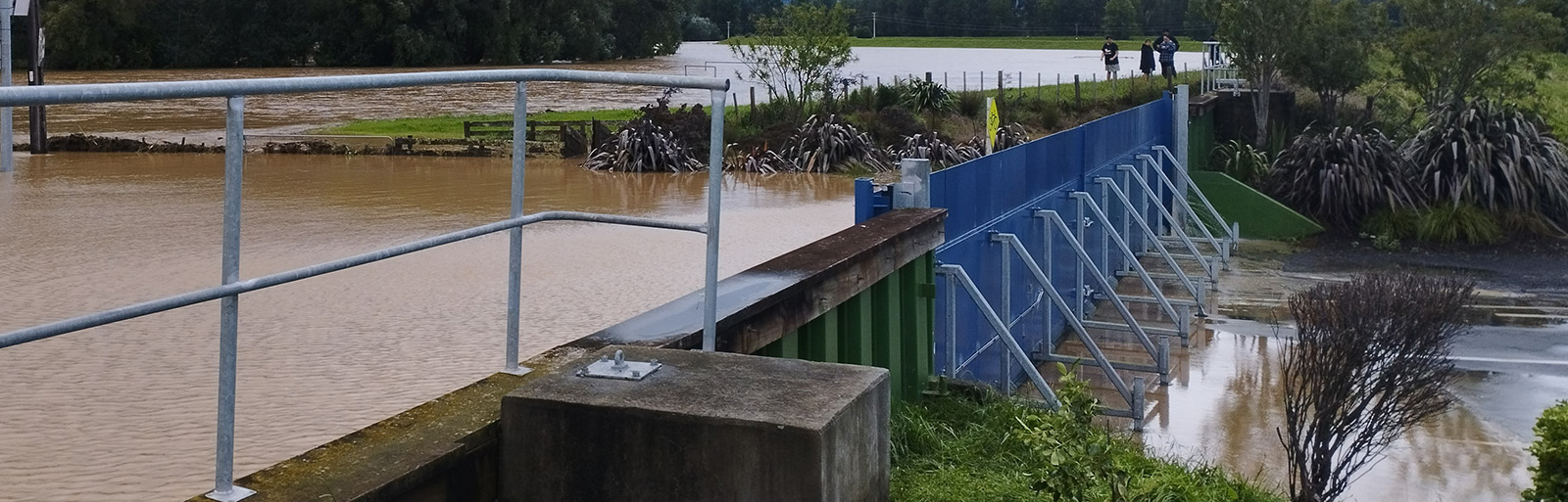 With all systems in working order, the blue mechanical floodgate continues to stand guard, ready to block the gap in the stop bank on the western bank of the river, while the stoplog system made up of two wooden pieces is on standby to take care of the eastern side of the river during larger flood events.
